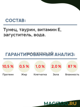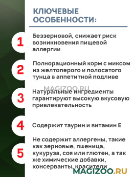 - Полнорационный корм с миксом из желтоперого и полосатого тунца в аппетитной подливе.