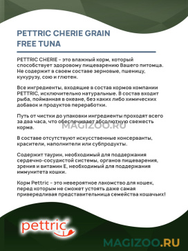 PETTRIC CHERIE – это влажный корм, который способствует здоровому пищеварению Вашего питомца. Не содержит в своем составе зерновые, пшеницу, кукурузу, сою и глютен.