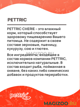 PETTRIC CHERIE – это влажный корм, который способствует здоровому пищеварению Вашего питомца. Не содержит в своем составе зерновые, пшеницу, кукурузу, сою и глютен.