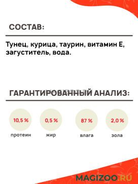 Тунец, курица, таурин, витамин Е, загуститель, вода.