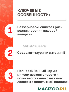 - Полнорационный корм с миксом из желтоперого и полосатого тунца с измельченным сочным белым мясом курицы в аппетитной подливе.
