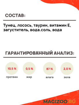 - Полнорационный корм с миксом из желтоперого и полосатого тунца с нежным лососем в аппетитной подливе.
