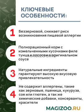 - Полнорационный корм с измельченными кусочками филе тунца и лососем в оригинальном соусе.