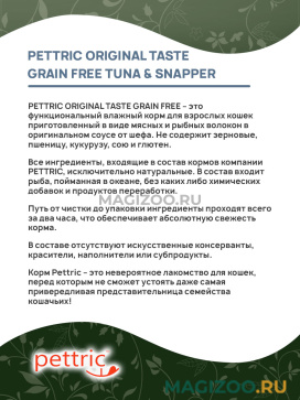 PETTRIC ORIGINAL TASTE GRAIN FREE – это функциональный влажный корм для взрослых кошек приготовленный в виде мясных и рыбных волокон в оригинальном соусе от шефа. Не содержит зерновые, пшеницу, кукурузу, сою и глютен.