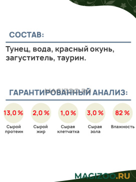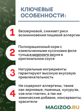 - Полнорационный корм с измельченными кусочками филе тунца и морского окуня в оригинальном соусе.