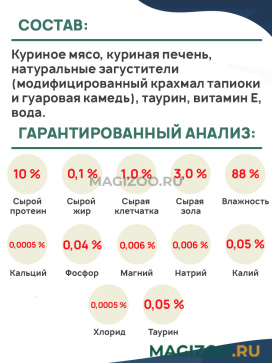 Куриное мясо, куриная печень, натуральные загустители (модифицированный крахмал тапиоки и гуаровая камедь), таурин, витамин E, вода.