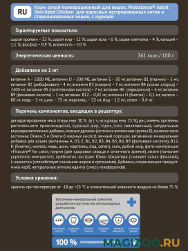 Сухой корм PROBALANCE STERILIZED c курицей предназначен для ежедневного кормления взрослых кастрированных котов и стерилизованных кошек.