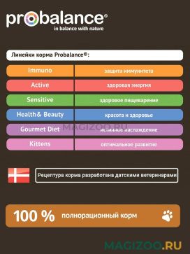 Рецептуры и технологии производства кормов PROBALANCE разработаны при участии ветеринарных диетологов, а так же при содействии ведущих мировых экспертов в области разработки кормов для животных. Для производства кормов используется только высококачественное сырье преимущественно зарубежных поставщиков.