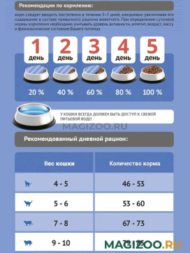 Основа корма – мясо двух видов (курицы и индейки). Это важные источники животного белка, который каждый день нужен кошкам. Рацион рекомендован для ежедневного кормления взрослых кошек всех пород.