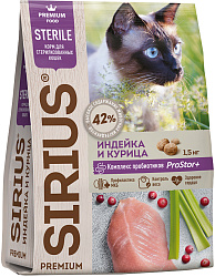SIRIUS — сухой корм премиум-класса для полноценного ежедневного рациона кастрированных котов и стерилизованных кошек.