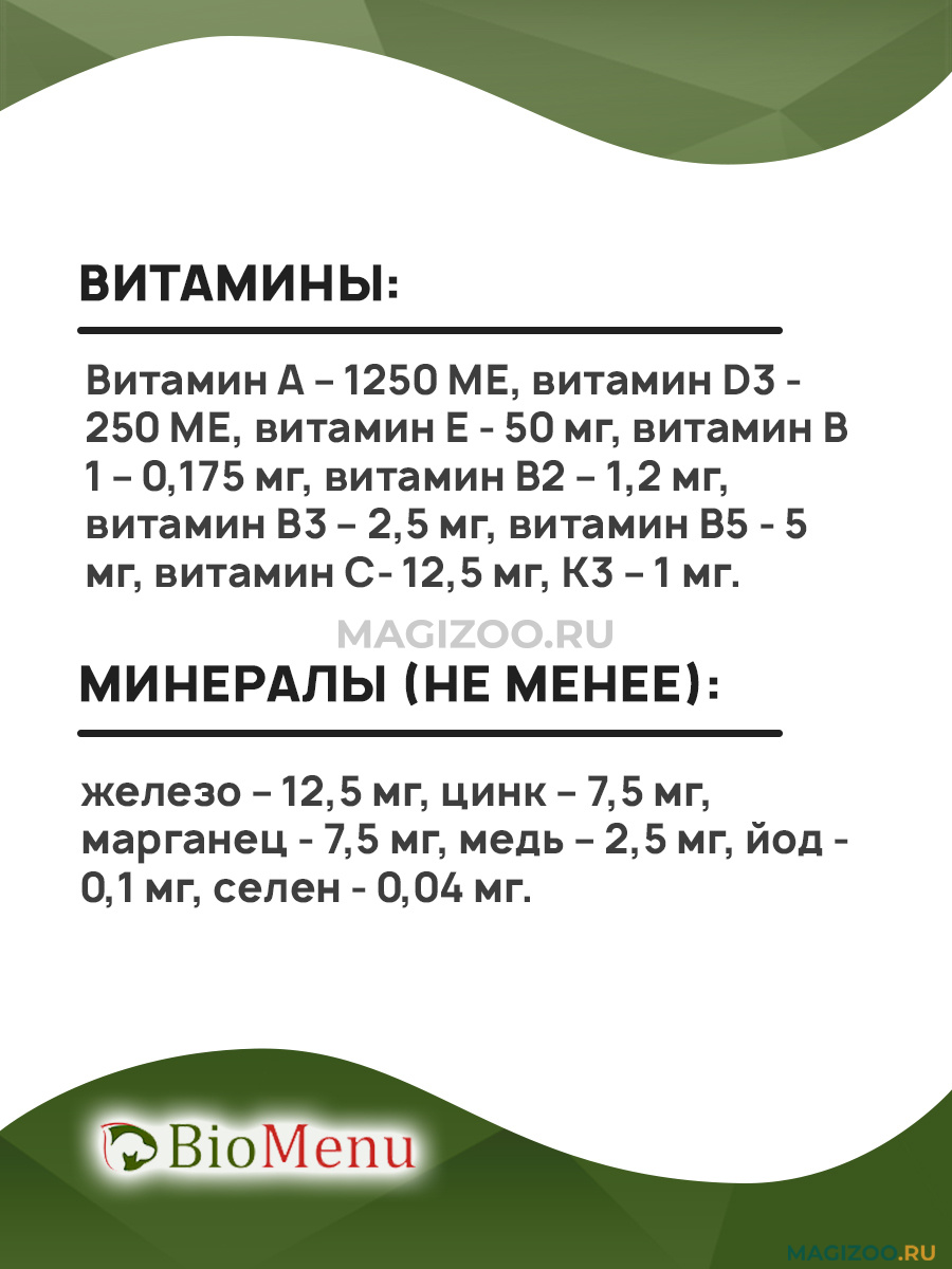 Информация о составе и ингредиентах, цветовом решении, технических и иных характеристиках, стране-изготовителе, внешнем виде и комплекте поставки товара носит справочный характер и основана на последних доступных к моменту публикации сведениях. Доставка данного товара осуществляется во все регионы РФ.BioMenu - это корма нового поколения, созданные специально для хищников.