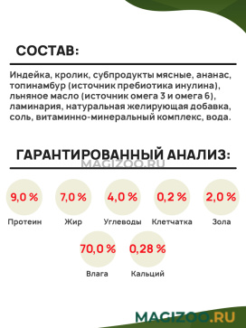 Индейка, кролик, субпродукты мясные, ананас, топинамбур (источник пребиотика инулина), льняное масло (источник омега 3 и омега 6), ламинария, натуральная желирующая добавка, соль, витаминно-минеральный комплекс, вода.
