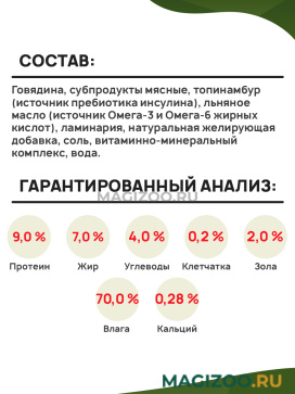 Говядина, субпродукты мясные, топинамбур (источник пребиотика инсулина), льняное масло (источник Омега-3 и Омега-6 жирных кислот), ламинария, натуральная желирующая добавка, соль, витаминно-минеральный комплекс, вода.