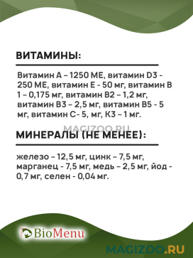 Витамин A – 1250 ME, витамин D3 - 250 МЕ, витамин E - 50 мг, витамин В1 – 0,175 мг, витамин B2 – 1,2 мг, витамин B3 – 2,5 мг, витамин B5 - 5 мг, витамин C- 5, мг, К3 – 1 мг.