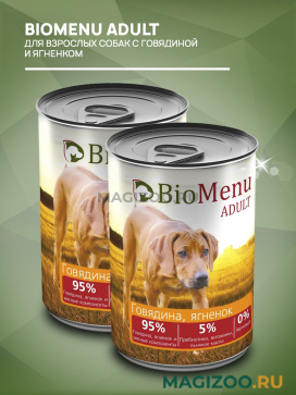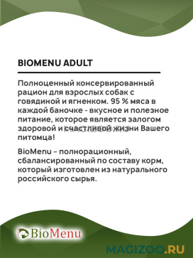 Полноценный консервированный рацион для взрослых собак с говядиной и ягненком. 95 % мяса в каждой баночке - вкусное и полезное питание, которое является залогом здоровой и счастливой жизни Вашего питомца!