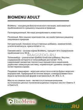 Информация о составе и ингредиентах, цветовом решении, технических и иных характеристиках, стране-изготовителе, внешнем виде и комплекте поставки товара носит справочный характер и основана на последних доступных к моменту публикации сведениях. Доставка данного товара осуществляется во все регионы РФ.BioMenu - это корма нового поколения, созданные специально для хищников.