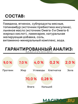 Говядина, ягненок, субпродукты мясные, топинамбур (источник пребиотика инсулина), льняное масло (источник Омега-3 и Омега-6 жирных кислот), ламинария, натуральная желирующая добавка, соль, витаминно-минеральный комплекс, вода.