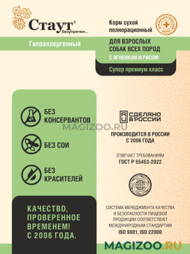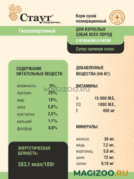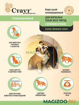"Стаут" в переводе с английского означает "сильный", "дородный", "ухоженный". Именно такое название должен носить первоклассный сбалансированный корм, обеспечивающий здоровое питание для Ваших кошек и собак.