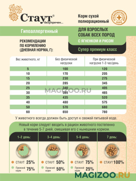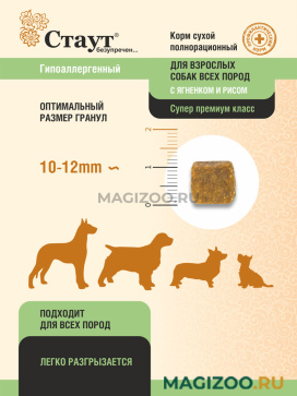 Кормление по программе «Стаут» обеспечивает надлежащую работу пищеварительного тракта, повышает иммунитет, заботится о здоровье мочевыводящей системы, замедляет процесс старения, положительно влияет на кожу и качество шерсти. Структура и форма гранул корма полностью адаптированы к особенностям строения ротовой полости животных различных видов и возраста.
