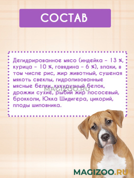 Дегидрированное мясо (индейка – 13 %, курица – 10 %, говядина – 6 %), злаки, в том числе рис, жир животный, сушеная мякоть свеклы, гидролизованные мясные белки, кукурузный белок, дрожжи сухие, рыбий жир лососевый, брокколи, Юкка Шидигера, цикорий, плоды шиповника.