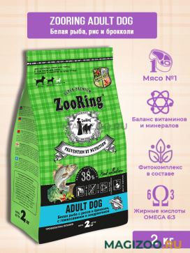 Полнорационный сухой корм для взрослых собак всех пород ZOORING ADULT DOG с белой рыбой, рисом, брокколи, глюкозамином и хондроитином.