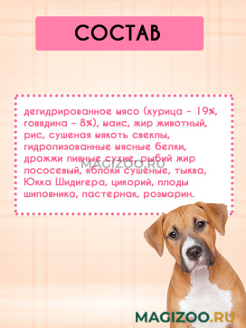 Состав: дегидрированное мясо (курица – 19%, говядина – 8%), маис, жир животный, рис, сушеная мякоть свеклы, гидролизованные мясные белки, дрожжи пивные сухие, рыбий жир лососевый, яблоки сушеные, тыква, Юкка Шидигера, цикорий, плоды шиповника, пастернак, розмарин.