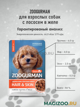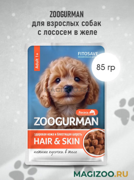 Полнорационный консервированный корм для здоровья кожи и шерсти взрослых собак с лососем в виде аппетитных кусочков в желе.