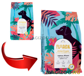 Сухой корм супер - премиум класса с курицей и яблоком взрослых собак. Сбалансированное питание, способствующее правильному функционированию всего организма. В рационе кормов Florida используется только белок животного происхождения.