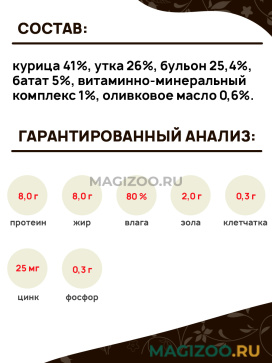 Состав: курица 41%, утка 26%, бульон 25,4%, батат 5%, витаминно-минеральный комплекс 1%, оливковое масло 0,6%.