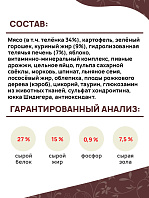 Мясо (в т.ч. телёнка 25 %, ягнёнка 5 %, кабана 5 %), картофель, зелёный горошек, жир индейки (9 %), гидролизованная свиная печень (6%), витаминно-минеральный комплекс, пивные дрожжи, цельное яйцо, пульпа сахарной свёклы, яблоко, морковь, тыква, льняное семя, лососёвый жир, черника, ламинария, куркума, розмарин, экстракт бархатцев прямостоячих, цикорий, таурин, глюкозамин из животных тканей, сульфат хондроитина, Юкка Шидигера, антиоксидант.