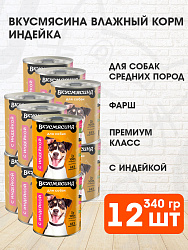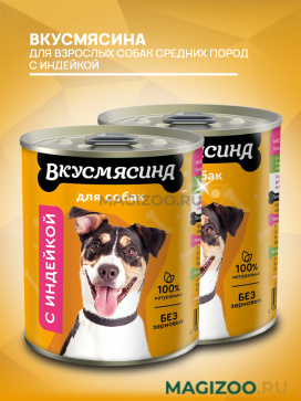 Полнорационный консервированный корм для взрослых собак ВКУСМЯСИНА с индейкой.