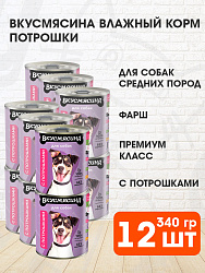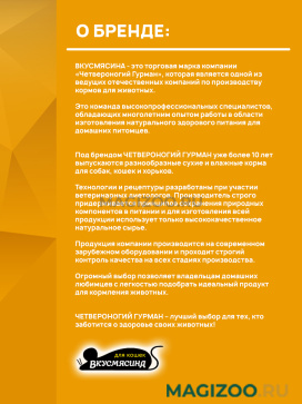 ВКУСМЯСИНА - это корм, приготовленный с учетом потребностей и предпочтений животных. В его рецептуре самые вкусные и лакомые для собак мясные компоненты.