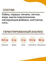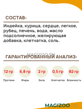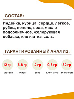Индейка, курица, сердце, легкое, рубец, печень, вода, масло подсолнечное, желирующая добавка, клетчатка, соль.