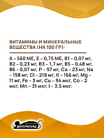 Витамины и минеральные вещества (на 100 гр): А – 560 МЕ, Е – 0,76 МЕ, В1 – 0,05 мг, В2 – 0,24 мг, В3 – 1,81 мг, В5 – 0,62 мг, В6 – 0,13 мг, P – 129 мг, Ca – 9 мг, Na – 160 мг, Cl – 203 мг, K – 241 мг, Mg – 14 мг, Fe – 3 мг, Cu – 213 мкг, Co – 2 мкг, Mn – 32 мкг, I – 3 мкг.