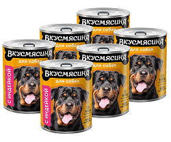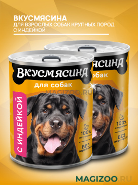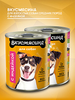 Полнорационный консервированный корм для взрослых собак ВКУСМЯСИНА с индейкой.