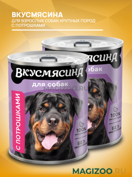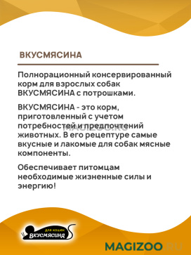 Полнорационный консервированный корм для взрослых собак ВКУСМЯСИНА с потрошками.