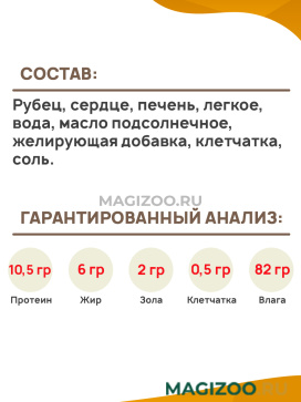 Рубец, сердце, печень, легкое, вода, масло подсолнечное, желирующая добавка, клетчатка, соль.