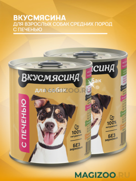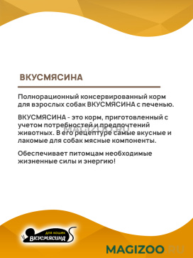 Полнорационный консервированный корм для взрослых собак ВКУСМЯСИНА с печенью.