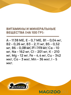 - Не содержит зерновых, сои, искусственных красителей, ароматизаторов, генномодифицированных ингредиентов.