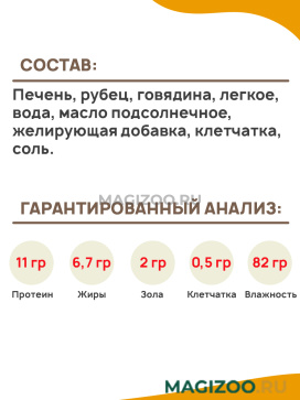 Печень, рубец, говядина, легкое, вода, масло подсолнечное, желирующая добавка, клетчатка, соль.