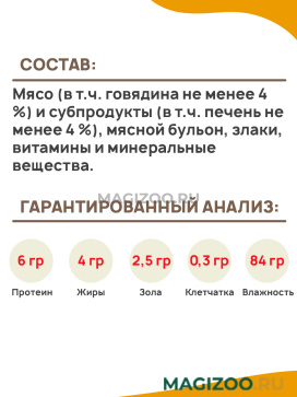 Мясо (в т.ч. говядина не менее 4 %) и субпродукты (в т.ч. печень не менее 4 %), мясной бульон, злаки, витамины и минеральные вещества.