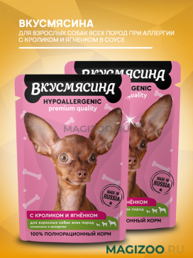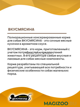 ВКУСМЯСИНА - это корм, приготовленный с учетом потребностей и предпочтений животных. В его рецептуре самые вкусные и лакомые для собак мясные компоненты.