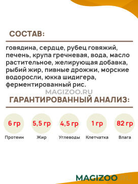Состав: говядина, сердце, рубец говяжий, печень, крупа гречневая, вода, масло растительное, желирующая добавка, рыбий жир, пивные дрожжи, морские водоросли, юкка шидигера, ферментированный рис.