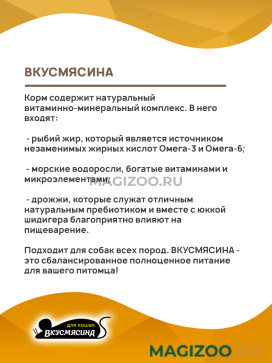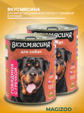Подходит для собак всех пород. ВКУСМЯСИНА - это сбалансированное полноценное питание для вашего питомца!