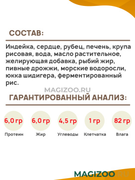 Индейка, сердце, рубец, печень, крупа рисовая, вода, масло растительное, желирующая добавка, рыбий жир, пивные дрожжи, морские водоросли, юкка шидигера, ферментированный рис.