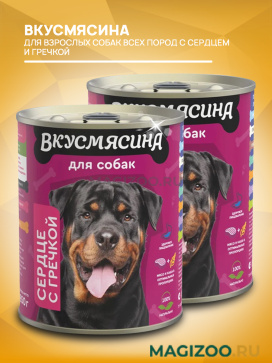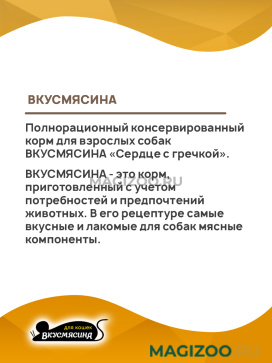 Полнорационный консервированный корм для взрослых собак ВКУСМЯСИНА «Сердце с гречкой».