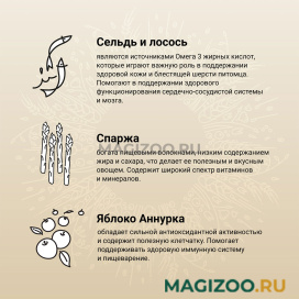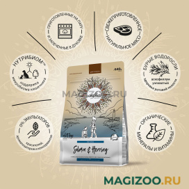 Лосось (15%), дегидратированный белок сельди (15%), сельдь (11%), дегидратированный белок лосося (11%), рыбий жир (лососевый), гидролизованный рыбий белок (треска, пикша), льняное семя, спельта, бурый рис, ячмень, овес, просо, сухая свекольная пульпа, люцерновая мука, волокна гороха, сушеное яблоко Аннурка (0,5%), сушеная спаржа (0,5%), сушеная черника, сушеная клюква, сушеная ацерола, инулин цикория (0,4%), дрожжевой экстракт (источник маннанолигосахаридов) (0,3%), фруктоолигосахариды (0,3%), аскофиллум узловатый (Ascophyllum Nodosum), карбонат кальция, монокальцийфосфат, хлорид калия, хлорид натрия, сухие пивные дрожжи, глюкозамин, хондроитина сульфат, алоэ вера, розмарин, куркума, календула, семена и шелуха подорожника, юкка Шидигера.