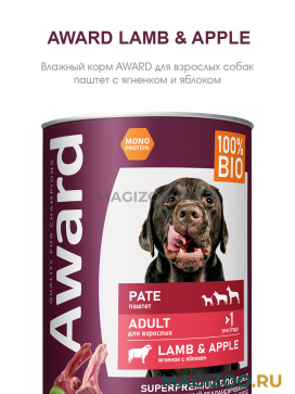 Влажный корм AWARD для взрослых собак паштет с ягненком и яблоком.