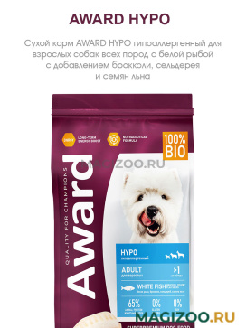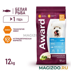 Сухой корм AWARD HYPO гипоаллергенный для взрослых собак всех пород с белой рыбой с добавлением брокколи, сельдерея и семян льна.