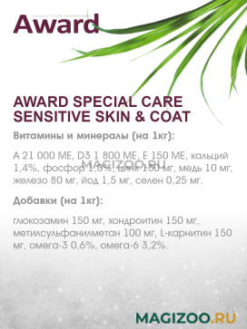 Информация о составе и ингредиентах, цветовом решении, технических и иных характеристиках, стране-изготовителе, внешнем виде и комплекте поставки товара носит справочный характер и основана на последних доступных к моменту публикации сведениях. Доставка данного товара осуществляется во все регионы РФ.Ключевые особенности кормов AWARD: